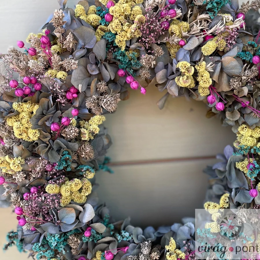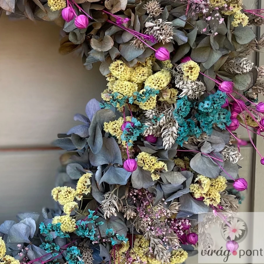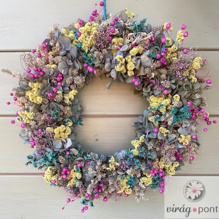 Egy vidám színtánc szárított virágokból – sárga, pink és kék árnyalatok fonódnak össze ebben a bohókás, mégis harmonikus koszorúban. Mosolyt csal minden érkező arcára.
